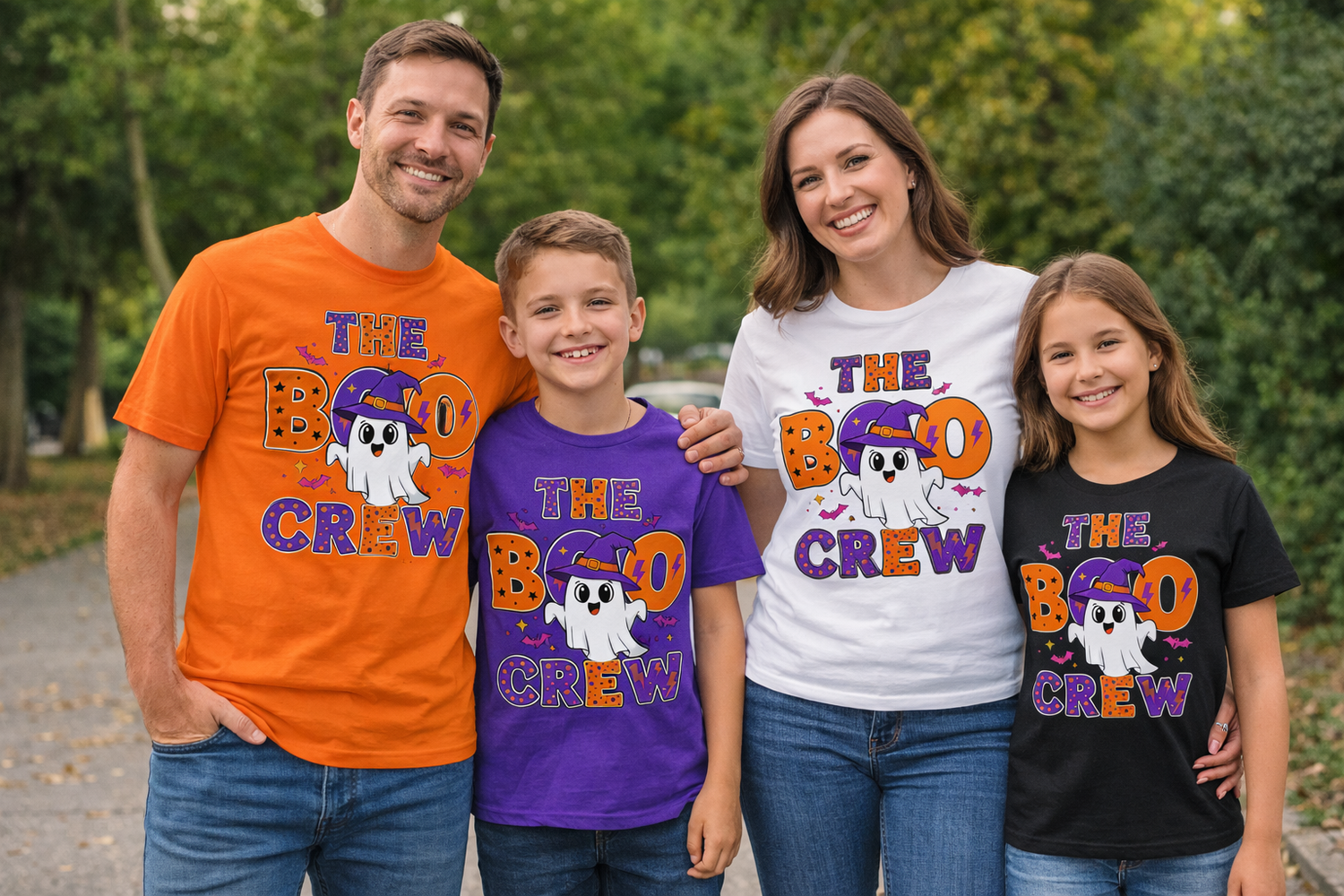 Our Halloween designs bring spooky fun to the whole family with matching graphic tees in orange, purple, white, and black. Our Halloween t-shirts are perfect for trick-or-treating, school events, dress-up days, and Halloween parties. Designed for kids and adults who love festive family outfits and bold Halloween style.